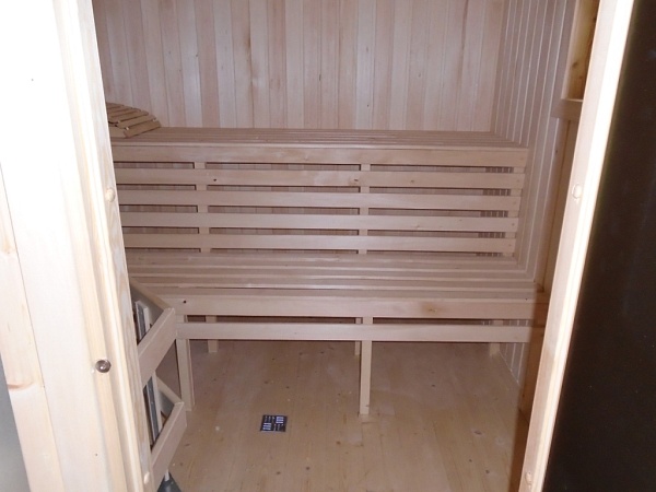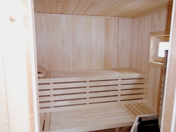 Двухъярусные осиновые полки, банная металлическая печь «Оса» со встроенным баком для горячей воды, дымоход от печки с искрогасителем и пожарной защитой, стол складной, 2 стула. |